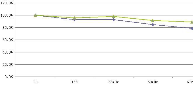 图1 如图1:是笔者老化的一款白光类产品亮度衰减图,所用配比:15%黄粉+10%扩散粉+2%抗沉淀粉+100%荧光胶。在30mA/1008Hr老化过程中发现亮度衰减过大。蓝色轨迹线为亮度(mcd),青色轨迹线为色温(K)。 图2 如图2:这是只用蓝光芯片不加白光配比荧光胶的产品老化亮度衰减图,30mA/1008Hr。蓝色轨迹线为亮度(mcd),青色轨迹线为主波长(λD)。 上面两款老化产品均为LAMP系列,工作电流时20MA一下的,老化条件就设定为:30mA散热主要是支架散热,支架厚度是0.5MM,除有无点荧光胶区别外,其余原物料均一样,老化条件也相同。 1.为什么在老化到334Hr后,亮度衰减就出现不一样的趋势,白光...
