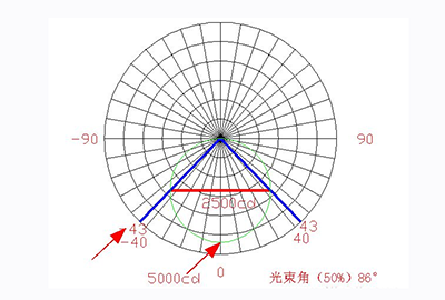 LED作为照明光源已经在许多领域得到广泛的应用,包括工业照明,道路照明,隧道照明,体育及场地照明等等。元亨光电自2002年成立以来一直致力于LED照明产品及应用的研发与生产,是LED照明方面的专家,前段时间发现有些朋友对LED照明光束角的概念不太理解,今天特地给大家讲诉下。 首先,什么是光束角? 通俗地讲,光束角是指光源或是灯具发出光束的角度,也就是光束一定强度范围边界所形成的夹角。对这个角度的定义一般有两种方式,即50%或10%中心光强所形成的夹角。 灯具的光束角在峰值光强的一半,也就是50%的光强处所对应的夹角,见图(配光曲线),某光源的峰值光强是5000Cd时的一半2500Cd处的红线两端对应的夹角(蓝色线),左右两边各是43°相加是86°...